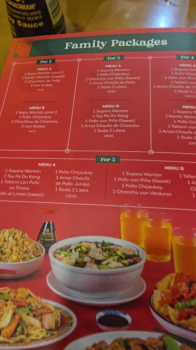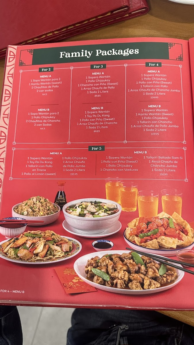 1 Sopera Wantán familiar 1 Tay Pa Du Kang 1 Pollo con piña (dulce) 1 Arroz chaufa de chancho familiar 1 Gaseosa de 2 litros (sujeto a stock)