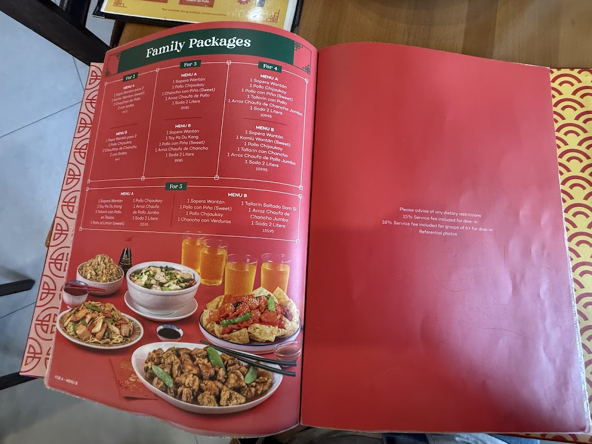 1 Sopera Wantán familiar 1 Tay Pa Du Kang 1 Tallarín saltado con pollo en trozos 1 Pollo con limón (agridulce) 1 Pollo Chi Jau Kay 1 Arroz chaufa de pollo familiar 1 Gaseosa de 2 litros (sujeto a stock)